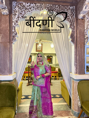 Paired with a delicately adorned odhna, this poshak strikes the perfect balance between tradition and sophistication. The subtle shimmer catches the light with every movement, making you the center of attention. Whether styled with heritage jewelry for a classic touch or minimal accessories for a modern twist, this ensemble is a celebration of timeless grace and royal charm.